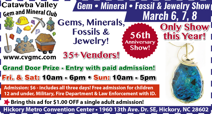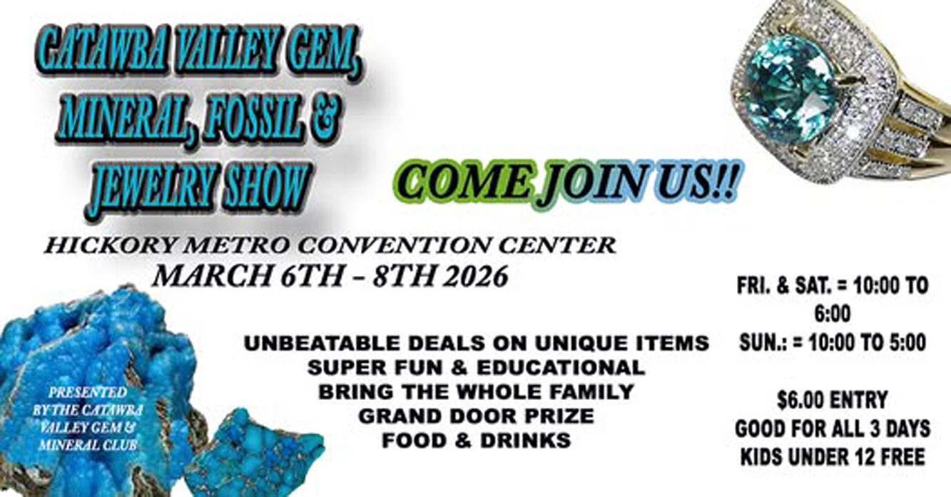 The Catawba Valley Gem and Mineral Club, Inc. will hold its 56th Annual Gem, Mineral, Fossil, and Jewelry show on March 6-8, 2026 at the Hickory Metro Convention Center in the Catawba and Sports Venue Rooms.