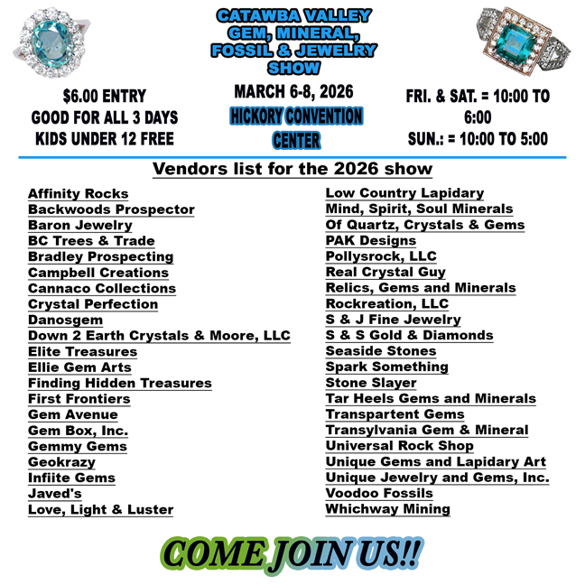 The Catawba Valley Gem and Mineral Club, Inc. will hold its 56th Annual Gem, Mineral, Fossil, and Jewelry show on March 6-8, 2026 at the Hickory Metro Convention Center in the Hickory Room.